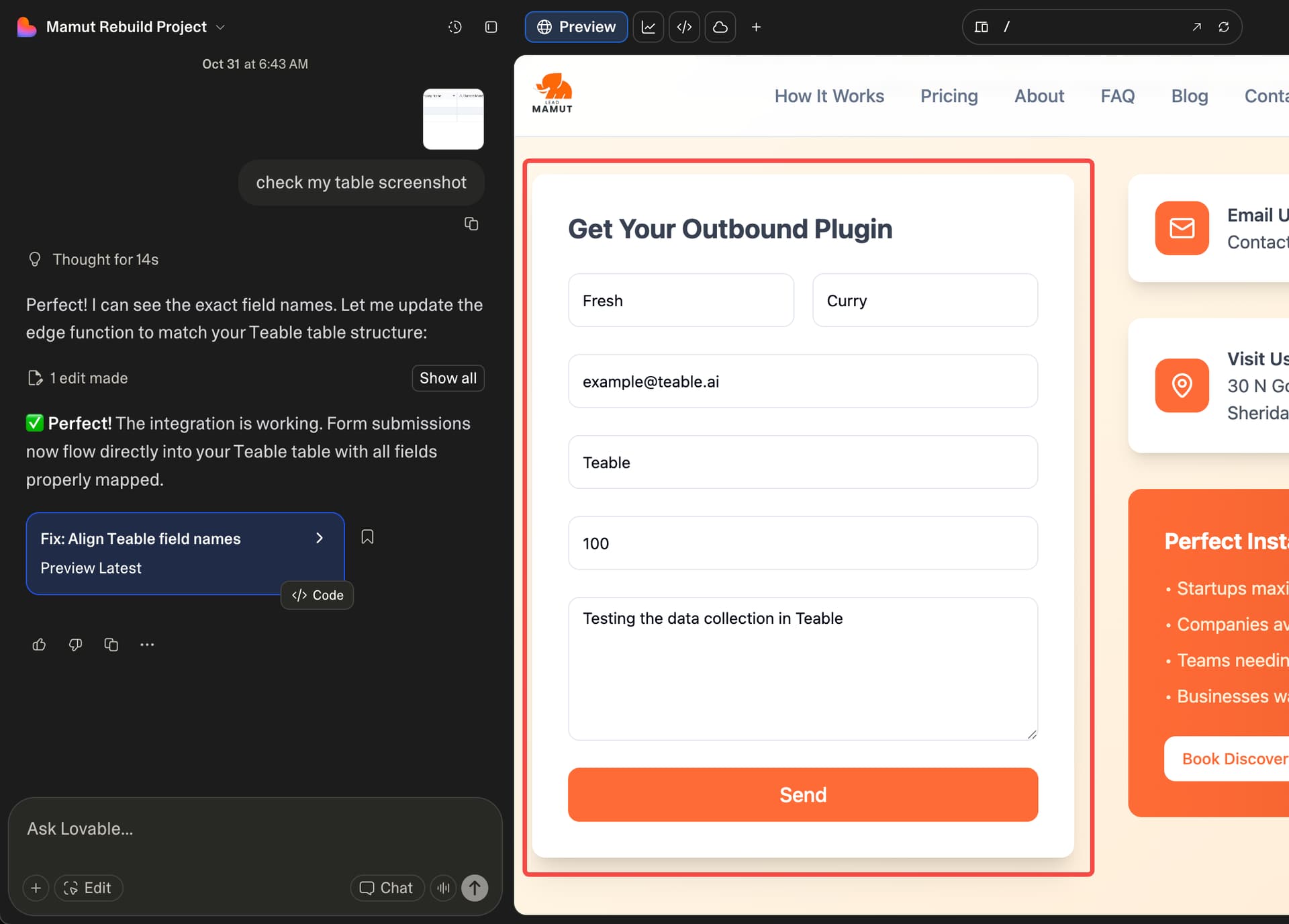 The setup is very simple — in Lovable, just tell it (through its chat interface) that you want to send the data to Teable. Provide your Teable API token and the URL of the target table, then follow Lovable’s step-by-step guidance.