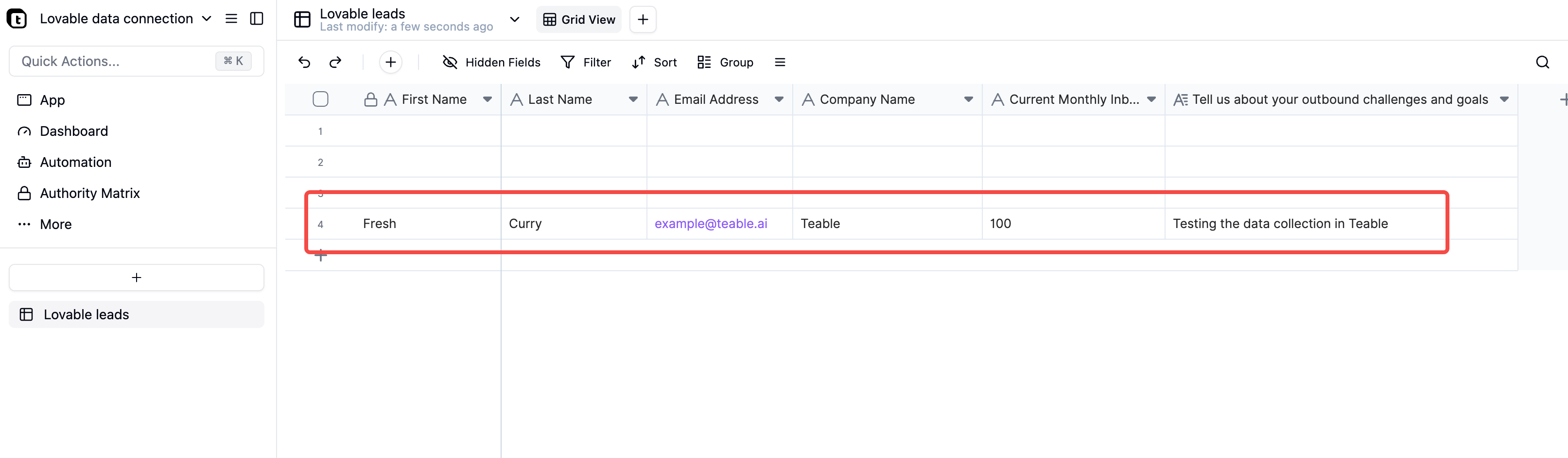 Teable can handle normal application data seamlessly. For example, if you built a consultation landing page in Lovable and visitors submit a form, that data can be sent directly into Teable.