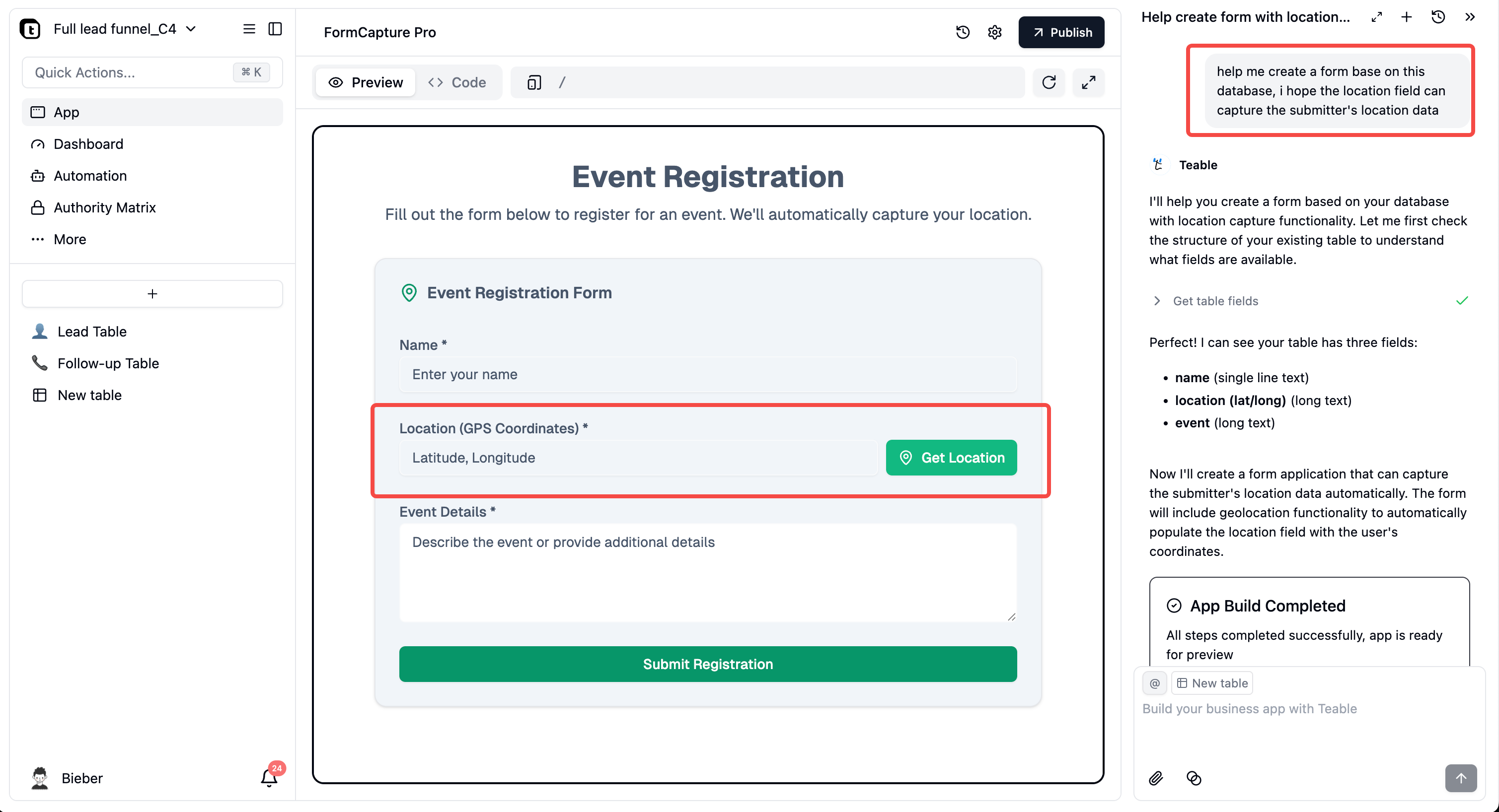You can leverage Teable’s new Talk to Build Apps on Data feature to create a form that captures the user’s location as part of the submission.
