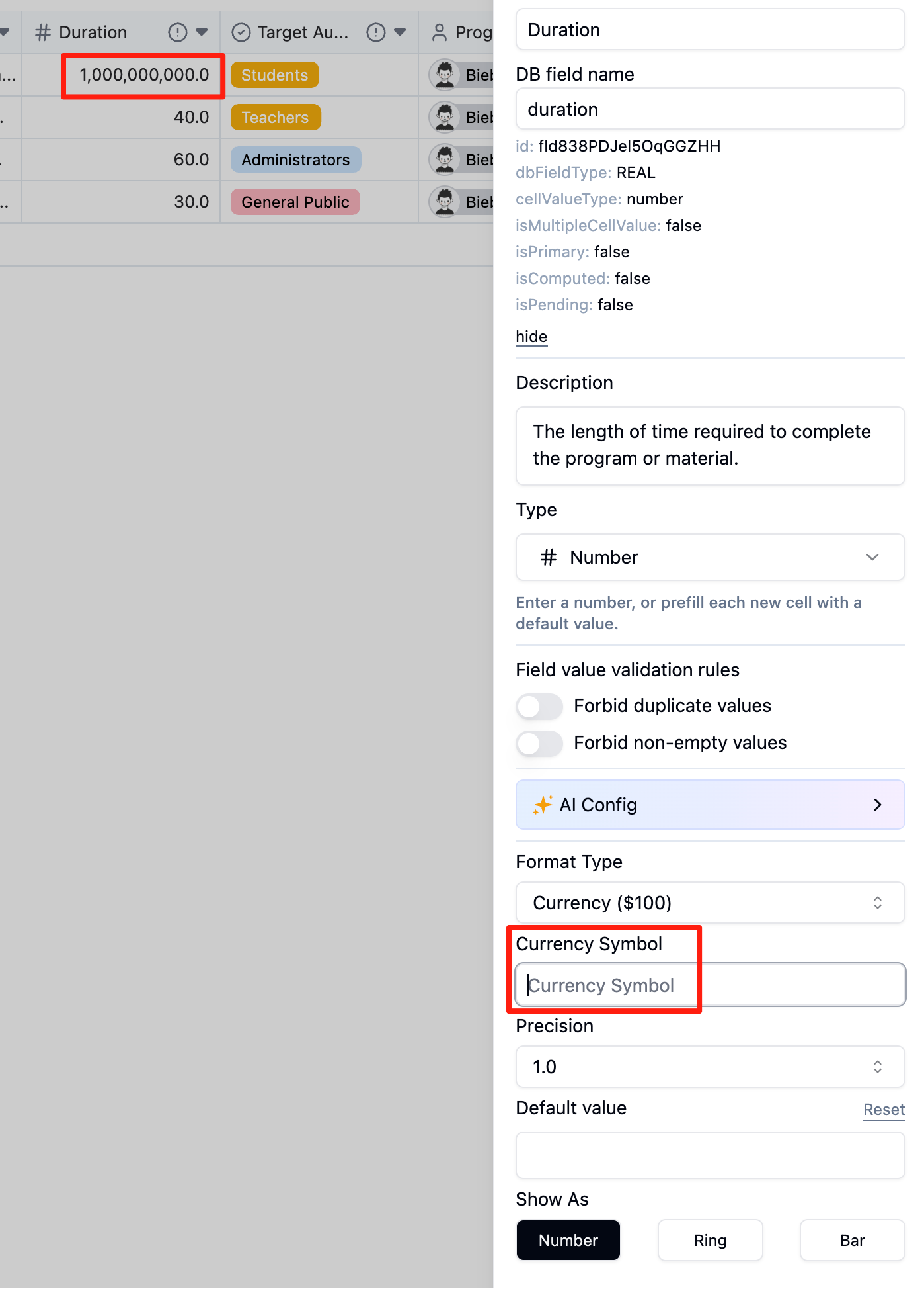 Concentration of chemical solutions spanning many orders of magnitudes. The decimal accuracy is limited and readability suffers. Scientific notation would help. Also thousands separators would help.