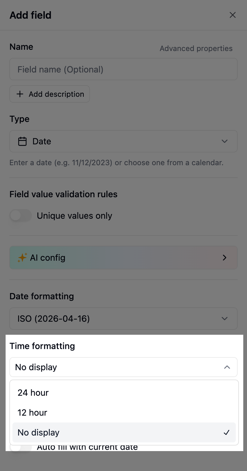 Click on the date field → Field settings → under Formatting, set the Time formatting to “No display”. This will display only the date (e.g., 2024-12-25) without the hours.