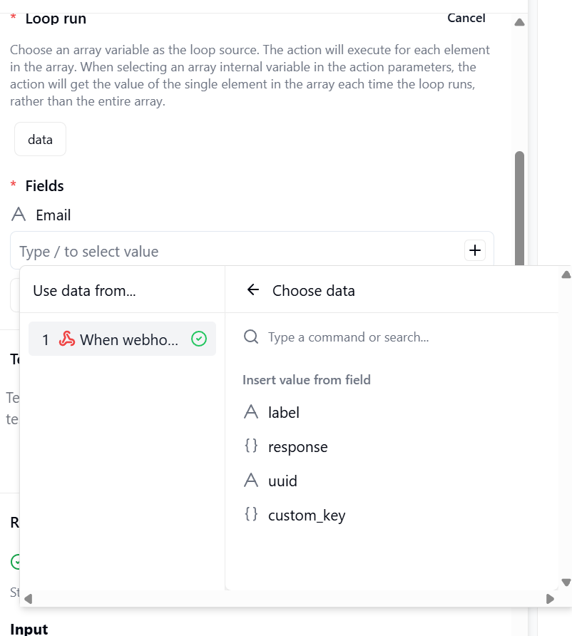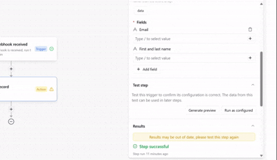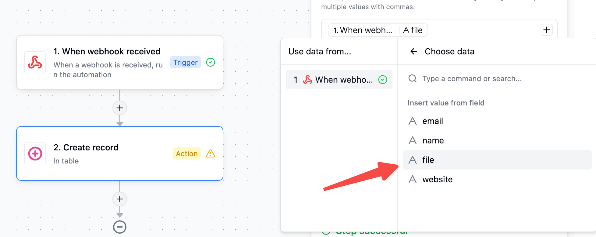 Add a “Create record” action, and you’ll see all the individual fields from your webhook data (email, name, file, website, etc.) available for mapping