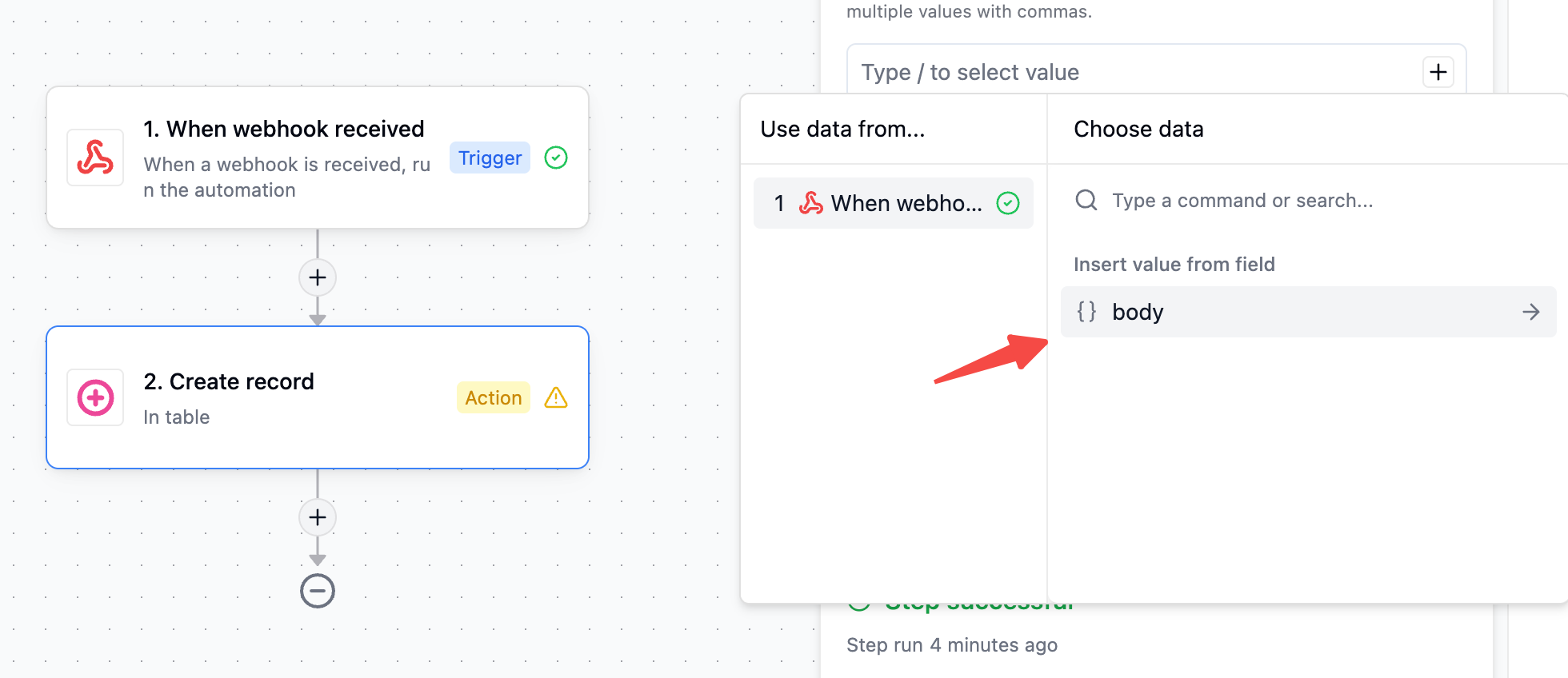 If the → arrow still doesn’t appear, could you share your actual webhook payload? We’d like to test with your exact data structure to see what’s different.